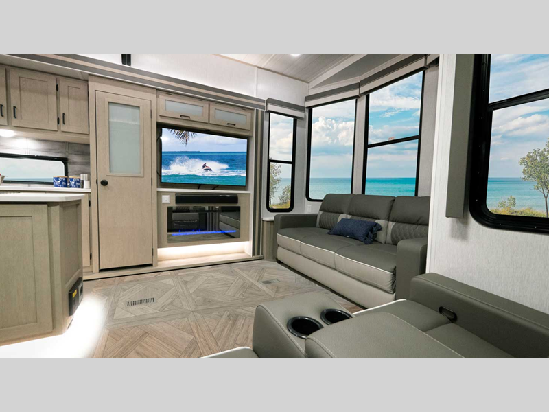Each destination trailer is built with a durable heated and enclosed Accessibelly, along with slide out awning toppers and a 7' slide out height in the living room so you can relax in comfort. There are JBL interior/exterior speakers, 4K awning blade lighting, and an on-demand tankless water heater to name a few more convenient features.