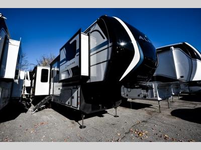 Sleeps 4 Slides 3 Length 37 ft 3 in Ext Width 8 ft 4 in Ext Height 13 ft 3 in Interior Color Lodge, Dovetail Exterior Color Blue Slate Full Body Paint, Copper Mist, Frost Black Hitch Weight 2560 lbs Dry Weight 13585 lbs Cargo Capacity 2915 lbs Fresh Water Capacity 75 gals Grey Water Capacity 83 gals Black Water Capacity 49 gals Tire Size 215/75R17.5H Furnace BTU 35000 btu Available Beds King Refrigerator Type Residential with Ice Maker Refrigerator Size 18 cu ft Convection Cooking Yes Cooktop Burners 3 Number of Awnings 2 Axle Weight 7000 lbs LP Tank Capacity 30 lbs Water Heater Type On Demand AC BTU 46500 btu TV Info LR 50" LED TV, BR Smart HDTV Awning Info 10' and 11' Carefree with Adjustable Arms Axle Count 2 Washer/Dryer Available Yes Number of LP Tanks 2 Shower Type Shower w/Seat Electrical Service 50 amp Similar Fifth Wheel Floorplans